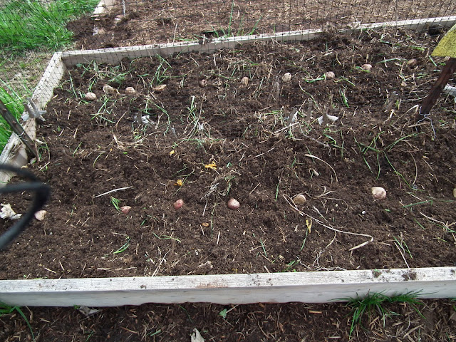 They were planted 3" deep. Once the foliage reached 6-8" I will hill the soil up around the base of the plants, leaving 4" of the plant above soil level. I then need to hill a second time 2-3 weeks later. Hilling protects potatoes from "greening," facilitates harvesting, reduces weed growth, and and protects plants from late frosts. I will use straw mulch to cover the potatoes after the second hilling.